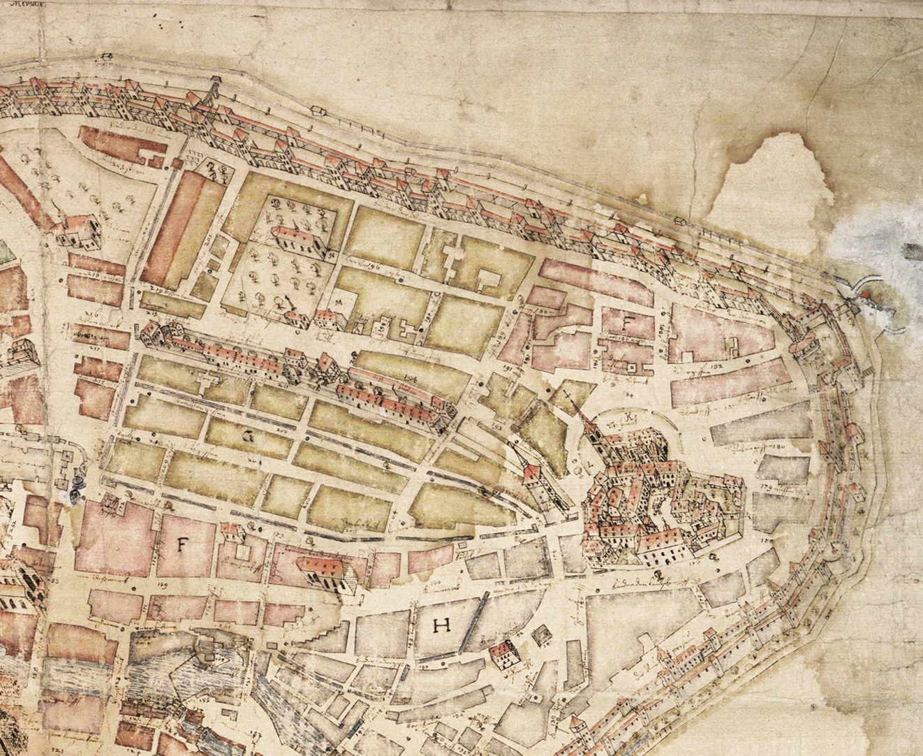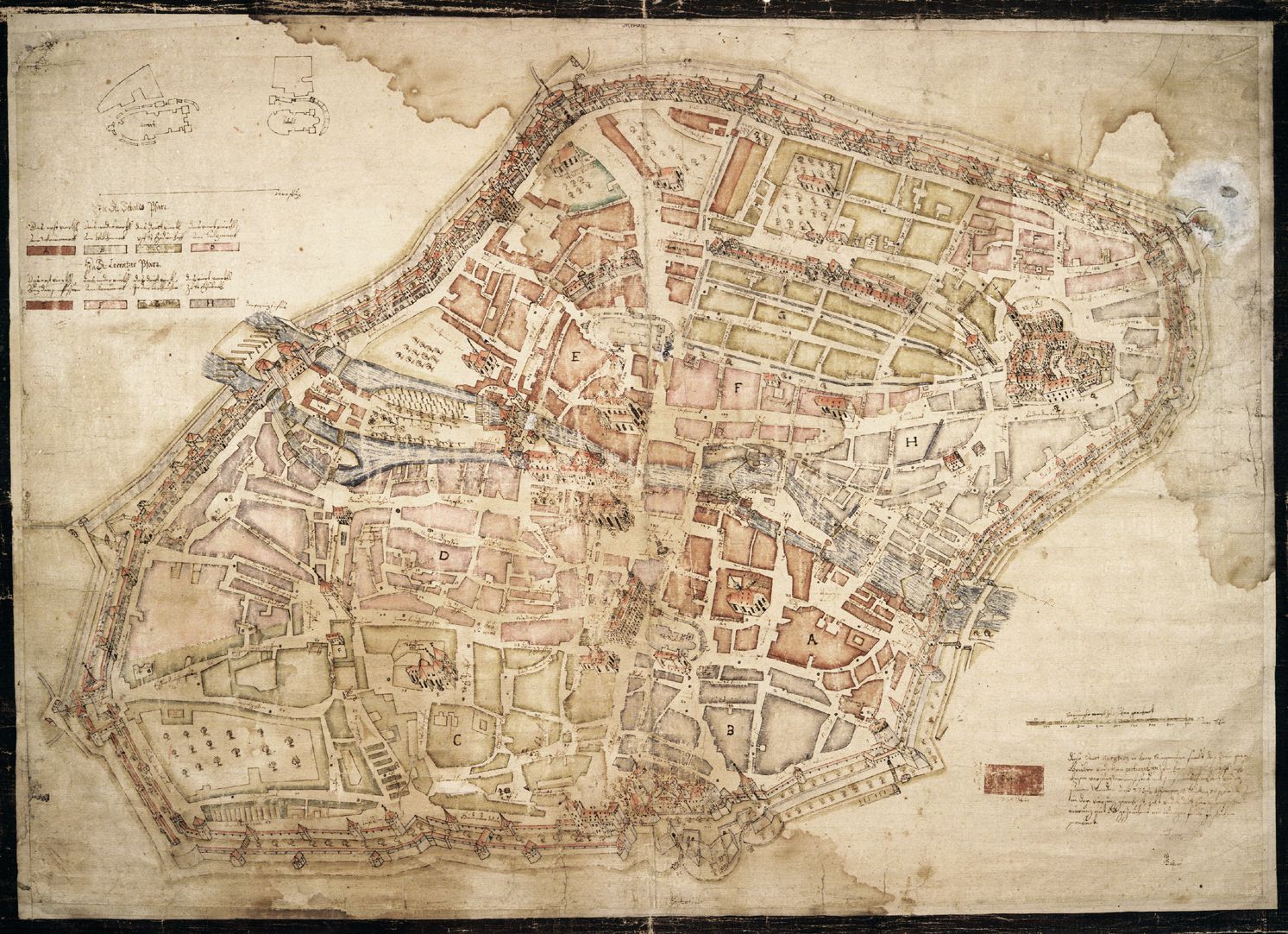 Gesamtansicht: die Stadtgrundriss wurde nach links gekippt, d.h. die Steilaufsicht wurde von Nordwest dargestellt, dementsprechend entstand eine schräge Axonometrie